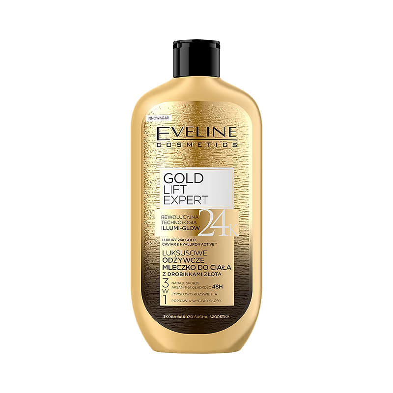 Eveline Luxury Expert 24k Mleczko do Ciała z Drobinkami Złota to luksusowy kosmetyk, który łączy zaawansowaną technologię pielęgnacyjną z eleganckim efektem rozświetlenia skóry. Dzięki formule opartej na 24-karatowym złocie i naturalnym kawiorze, mleczko intensywnie nawilża, odżywia i regeneruje nawet najbardziej suchą i szorstką skórę. Unikalna Hydra Luxury Molecular Technology oraz kompleks ekskluzywnych olejków i maseł sprawiają, że skóra odzyskuje jędrność, elastyczność oraz zdrowy, promienny wygląd.