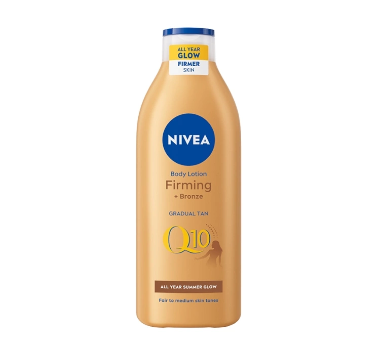 NIVEA Q10 Firming + Bronze to ujędrniający balsam do ciała, który powstał z myślą o suchej i bardzo suchej skórze. Bogata receptura zawiera drogocenny koenzym Q10, który zauważalnie ujędrnia cerę, poprawia jej elastyczność oraz zapewnia głębokie nawilżenie. Pozostawia ją gładką, napiętą, aksamitnie miękką w dotyku i pełną komfortu. Jego działanie możesz już zauważyć po 10 dniach regularnego stosowania. Dodatkowo nadaje skórze piękną, naturalną, równomierną opaleniznę, bez smug.